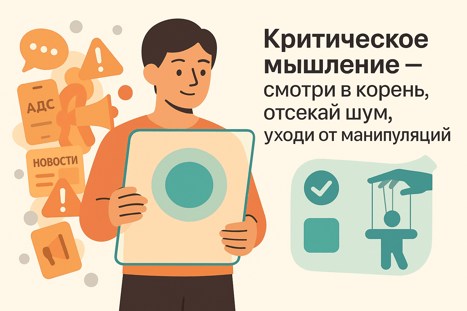 Реклама, политические заявления, тревожные новости, сильные личности — всё это может сильно влиять на выбор человека, если в голове нет устойчивых фильтров. Критическое мышление помогает замечать типичные приёмы: игра на страхе, подмена причин и следствий, ложные противопоставления, давление авторитетом. Вы начинаете слышать: «если не сделаете это прямо сейчас, всё будет потеряно», как сигнал включить голову, а не паниковать. Осознание таких механик не делает вас циничным, а возвращает ощущение, что вы — не марионетка в чужих сценариях, а человек, который может сказать «стоп, давайте проверим факты».